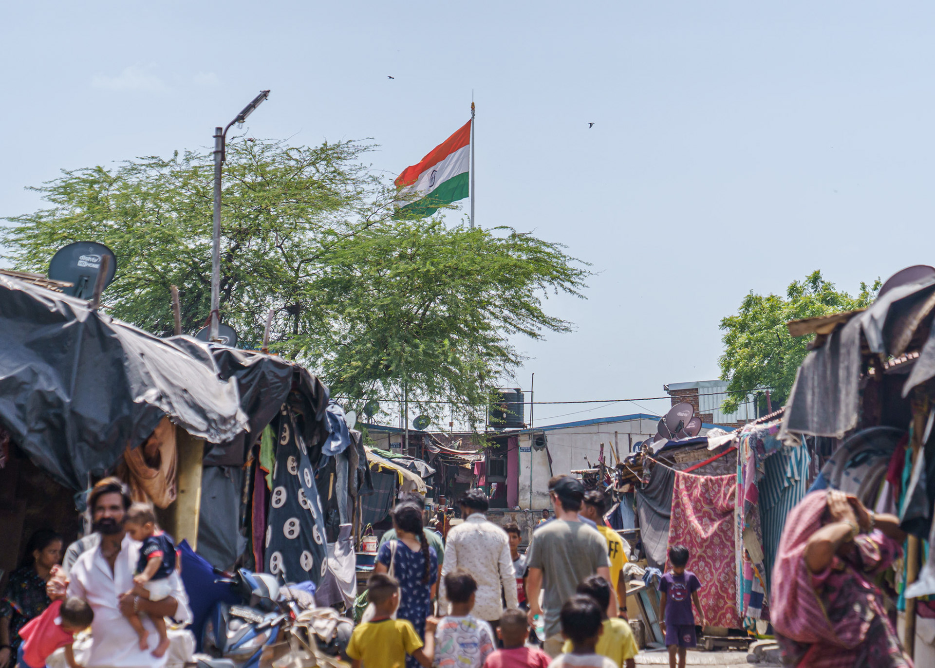 そのとき、ふと空を仰ぐと、スラムの上に、ひときわ大きなインド国旗が風にはためいていた。皮肉とも、象徴とも取れるその光景。不安定なシートの屋根越しに、堂々と掲げられた国家の象徴が見える。高く、遠く、こちらを見下ろすように。
