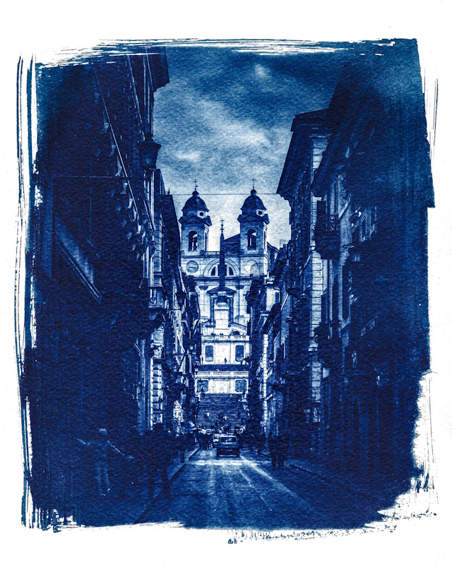 カロタイプと並ぶ最初期の印刷法で、プルシアンブルーの青色の濃淡が特徴的である。】