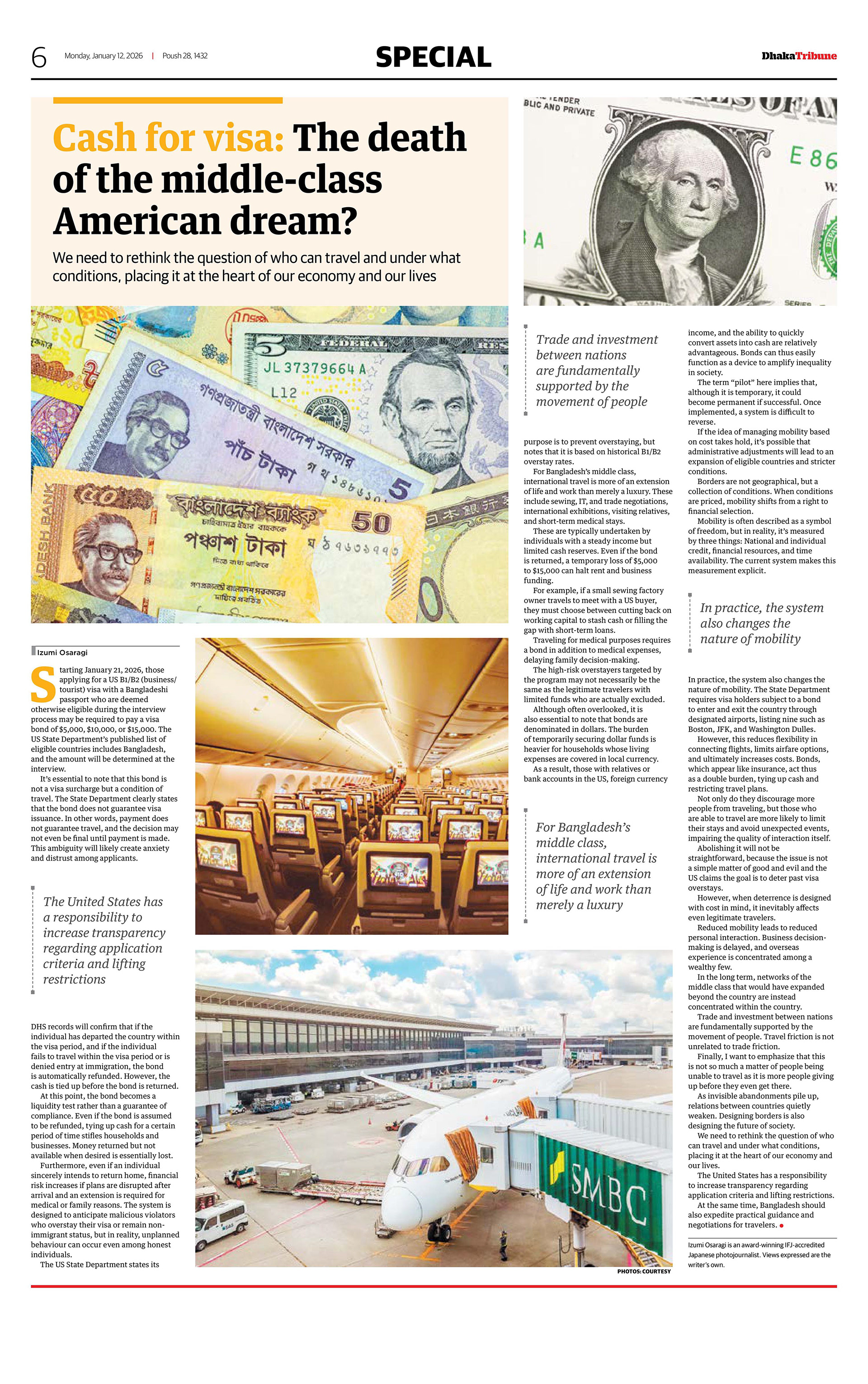 バングラデシュの英字全国紙『Dhaka Tribune』の特集記事として、署名記事 "Cash for visa: The death of the middle-class American dream? " が第6面 SPECIAL面にて掲載されました。本作は、米国のビザ保証金制度が、バングラデシュ中間層の渡航や商機・医療渡航を資金面で阻み、移動の自由を格差選別へ変えると警鐘を鳴らすことを読者へ提示しています。